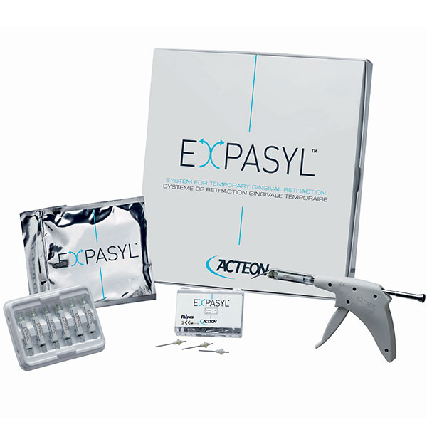 Mini-introduktionssæt med appliceringspistol, 6 Expasyl tubuler á 1 g, (ca 2-3 behandlinger pr. tubule) og 12 lige kanyler.