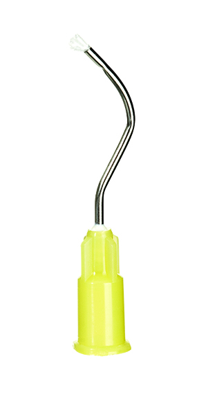 Engangsspids af gul plast med buet metalspids og hvide hår, 19G (tip: Ø 1,06 mm). Passer til alle sprøjter med luer/luer-lock gevind. Anvendes til indgnidning af Viscostat eller Astringedent i pochen.