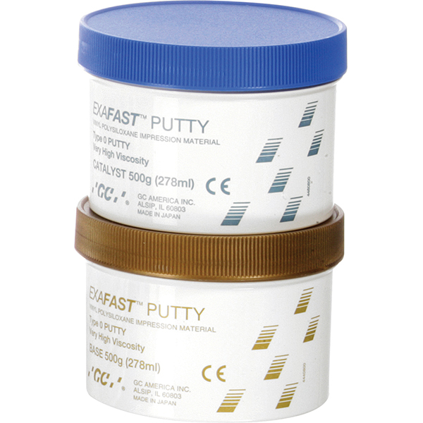 A-silikone putty i dåser, blå/gul, base og katalysator, i alt 1000 g, arbejdstid 1 min. 15 sek., afbindingstid i munden 2 min. 30 sek.