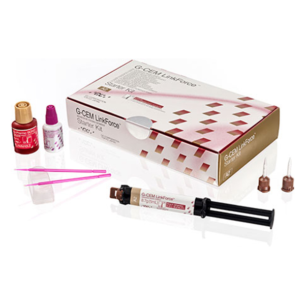 Sæt med G-Cem LinkForce A2 i automix sprøjte, G-Premio Bond og G-Multi Primer i flasker samt tilbehør.