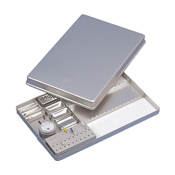 Endo-kassette, grå med låg, 284 x 184 mm, med instrumentstativ til 14 instrumenter, fileholder til 38 rodkanalinstrumenter, vatpelletæske, 2 medikamentskåle, boræske, 3-delt æske og Clean-Grip. OBS MÅ IKKE ANVENDES I DENTALOPVASKEMASKINER, DA FARVEN PÅVIRKES AF VISSE OPVASKEMIDLER.