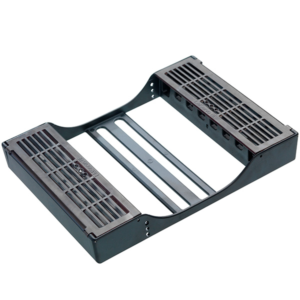 Kassette til 8 instrumenter, med holder, der fikserer instrumenterne og beskyttelsesskjold, der beskytter de arbejdende dele samt forhindrer stik uheld, 180 x 136 x 28 mm, med grå skjold.