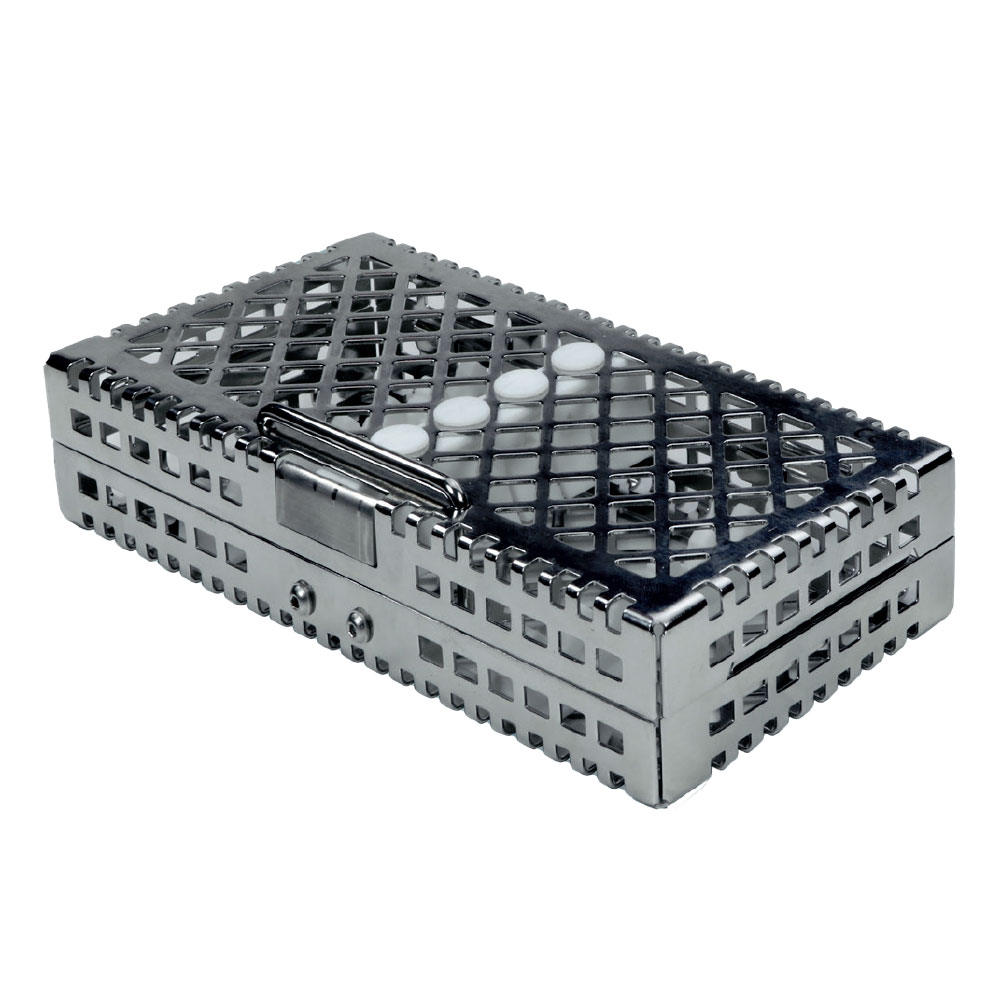 Rustfri stålkassette til 6 instrumenter, 190 x 92 x 34 mm, med hvid silikone instrumentholder, kassetten er med låg og lukning.