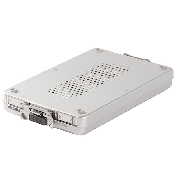 Sterilisationscontainer/box til MELAstore Tray 100, med perforeret låg med holder til filterpapir eller permanent filter, som købes separat. Kan rumme 1 MELAstore Tray 100 eller 2 MELAstore Tray 50.