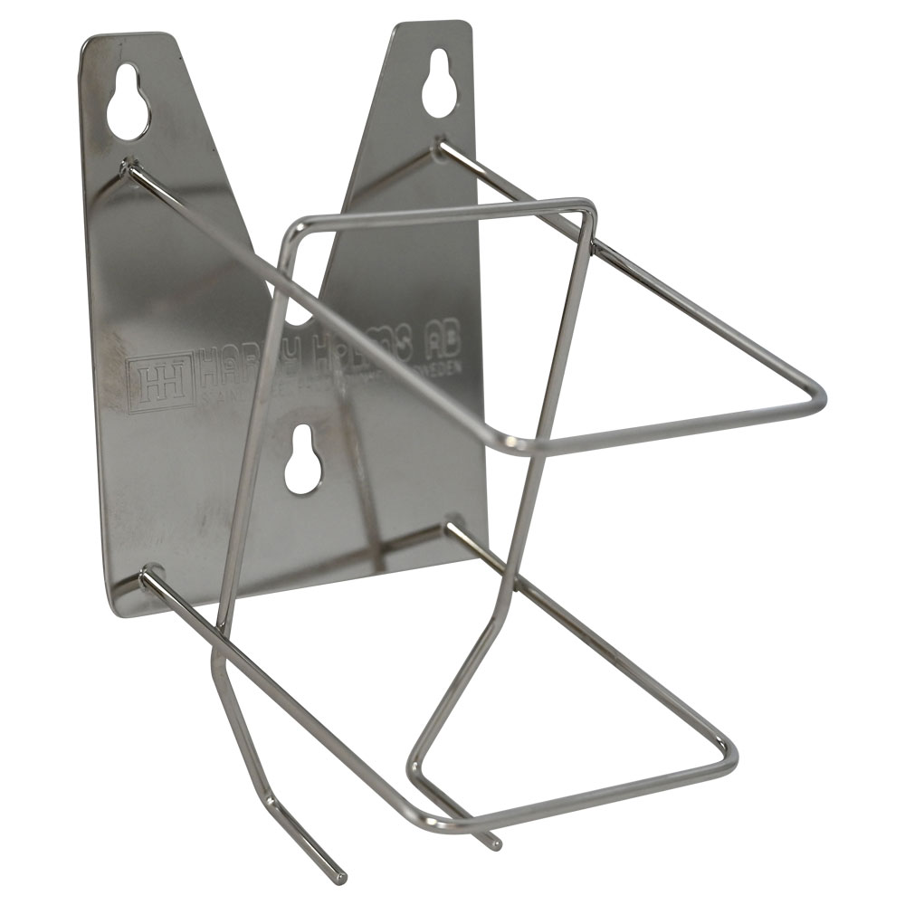 Væghængt dispenser, der passer til firkantede 600 ml flasker fra Topdent, i metal.