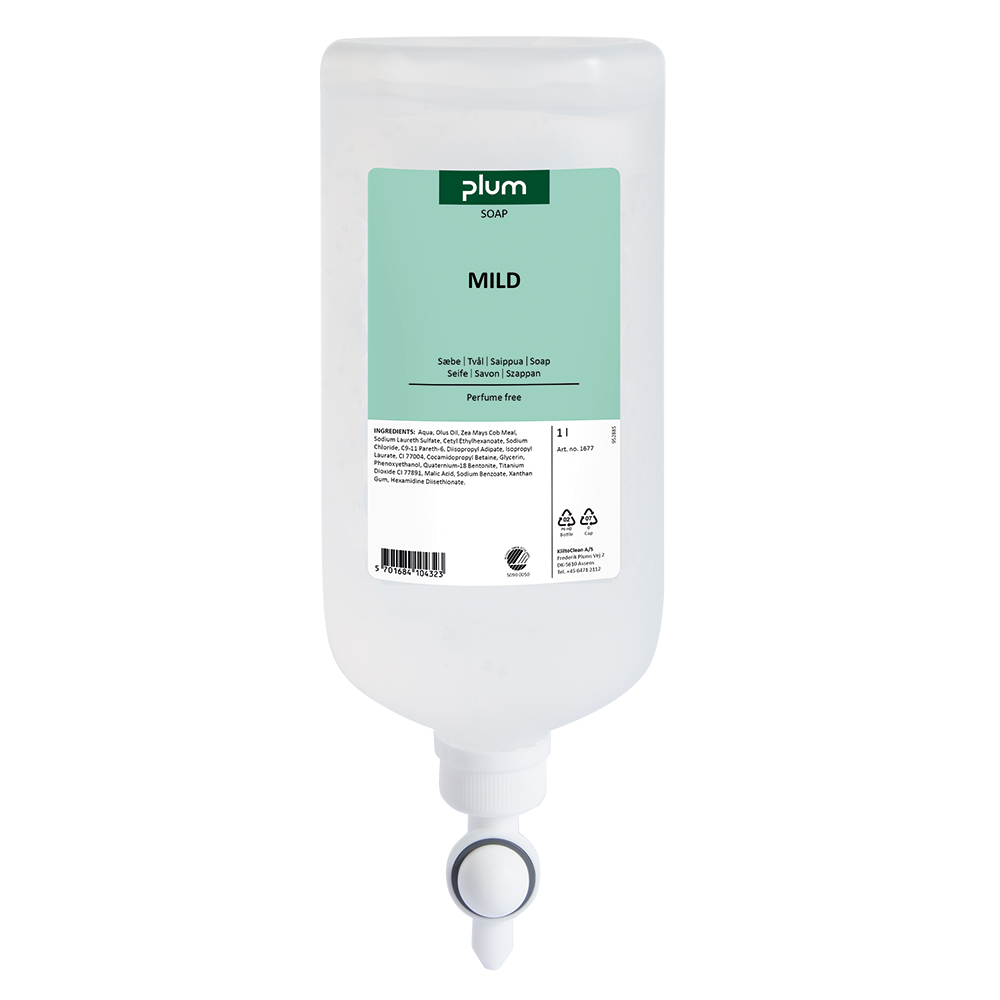 Svanemærket hudvenlig og meget mild flydende sæbe til hyppig håndvask, uden farve, parfume og parabener. Ref.nr. 1677. I standbag til brug i de fleste albuedispensere og i Informs skabe. Passer desuden i Combiplum dispenser varenr. 16506.