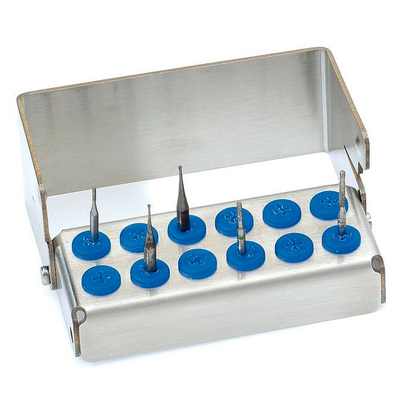 Borstander i rustfrit stål med bøjle. Anvendes til RA og FG bor, har plads til 12 bor, med blå farvemarkeringspropper. Størrelse 6,3 x 2,5 x 3 cm.