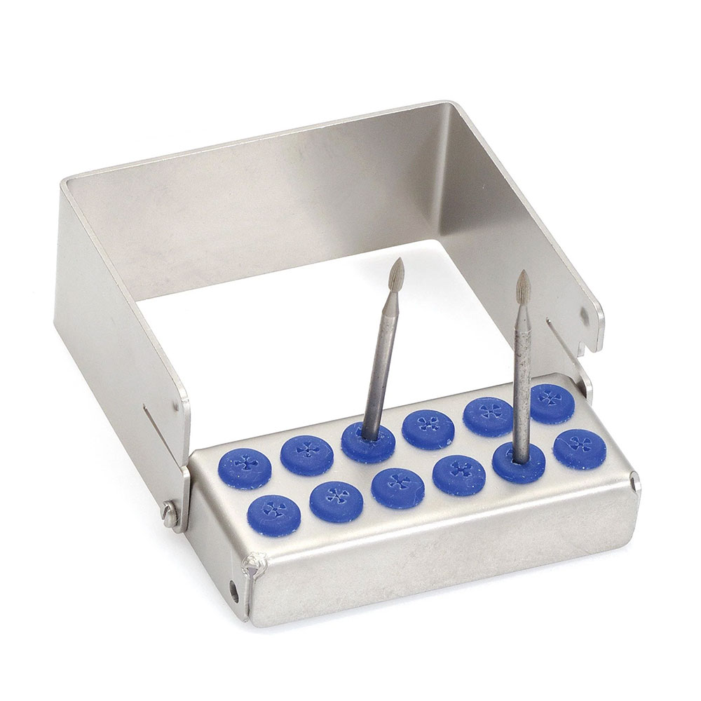 Borstander i rustfrit stål med bøjle. Anvendes til HP bor, har ekstra højde under bøjlen (5 cm) og med plads til 12 bor, med blå farvemarkeringspropper. Størrelse 7,5 x 2,5 x 5 cm.