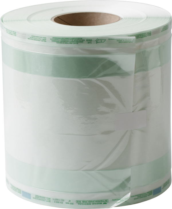 Papir/plast til autoklavering, dampgennemtrængeligt, bakterietæt papir med indikator på den ene side og plast på den anden, foliesvejser kan anvendes, 20 cm bred, indermål ca. 17,8 cm, grøn. Med 3-delt svejsesøm.