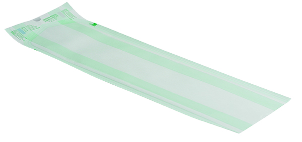 Papir/plast til autoklavering, dampgennemtrængeligt, bakterietæt papir med indikator på den ene side og plast på den anden, med fold, 20 x 5,5 x 40 cm, indermål ca. 17,8 x 5,5 x 33,4 cm, grøn. Med 3-delt svejsesøm.