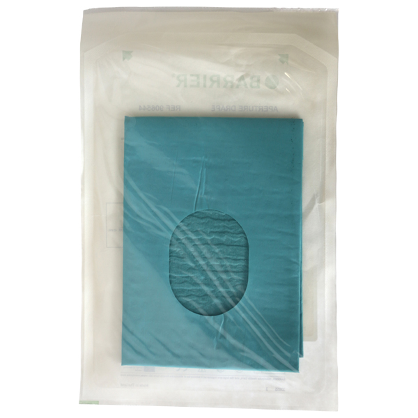 Sterilt hulstykke uden klæb til afdækning, 50 x 60 cm, hulstørrelse ovalt 6 x 8 cm.