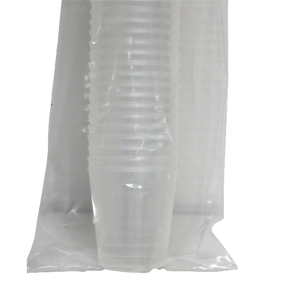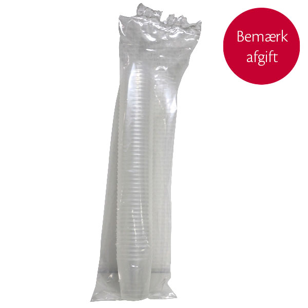 30 ml medicinbægre til fluorskylning, klare med milimeterinddeling, højde 40 mm, diameter 35 mm.
