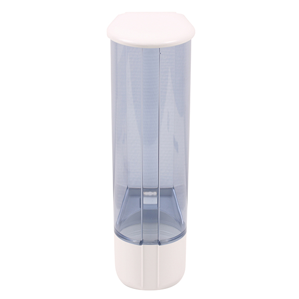 Vægdispenser i hvid plast til 60 bægre, 8 x 33 cm, passer til alle bægre i størrelsen 180 - 210 ml.
