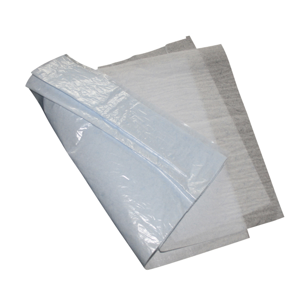 Patientservietter med plastbelægning på bagsiden, lyseblå, 30 x 38 cm, tynd kvalitet. Er ikke foldet i kassen.