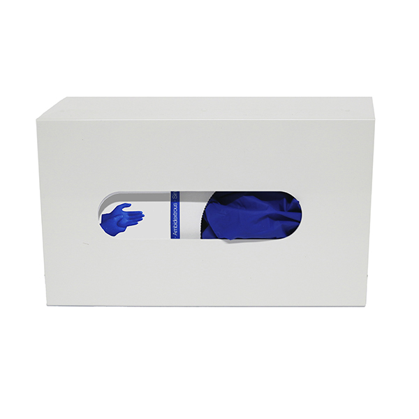 Handskedispenser i hvid plast med plads til 1 æske, stor model. Ydermål 28 x 16 x 10,5 indermål 26 x 14 x 8 cm. Passer bedst til store handskeæsker med 200 og 300 stk. Til vægophæng.