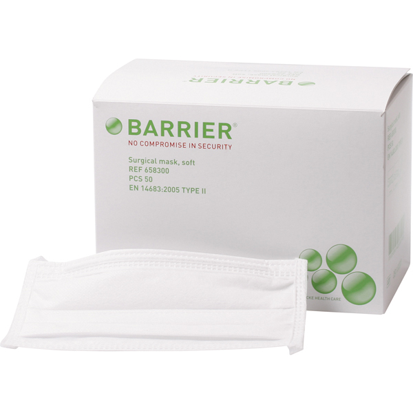 3-lags, hvid maske (uden farvestoffer), kopformet, ekstra blødt indermateriale, med bindebånd og næseklemme, opfylder EN14683 type II. Art.nr. 658300.