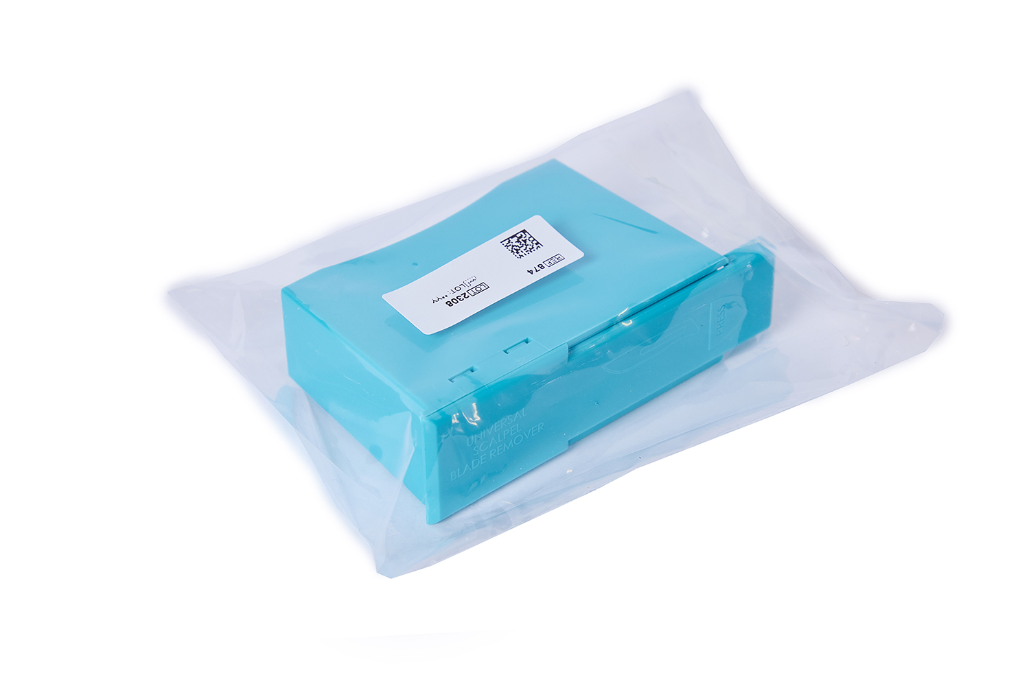 Boks til sikker afmontering af skalpelblade fra skaft uden risiko for at skære sig, bladet forbliver lukket inde i æsken. Blå, art. 874.