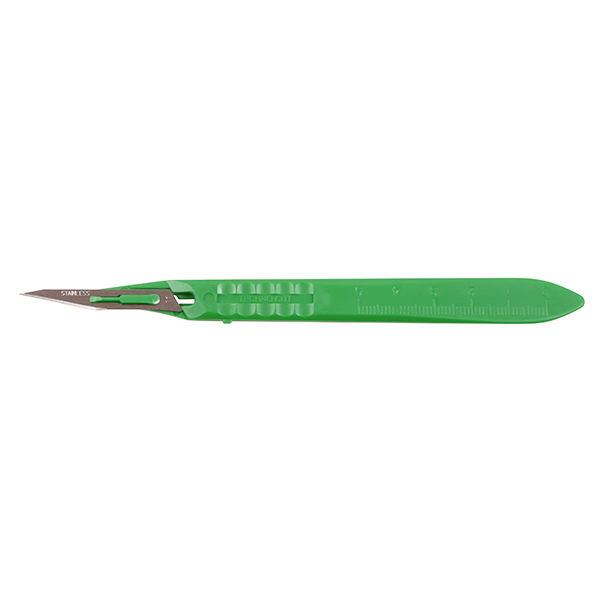 Skalpeller, grå plastskafter med rustfri blade, nr. 11, lancetformet-lige, sterile.