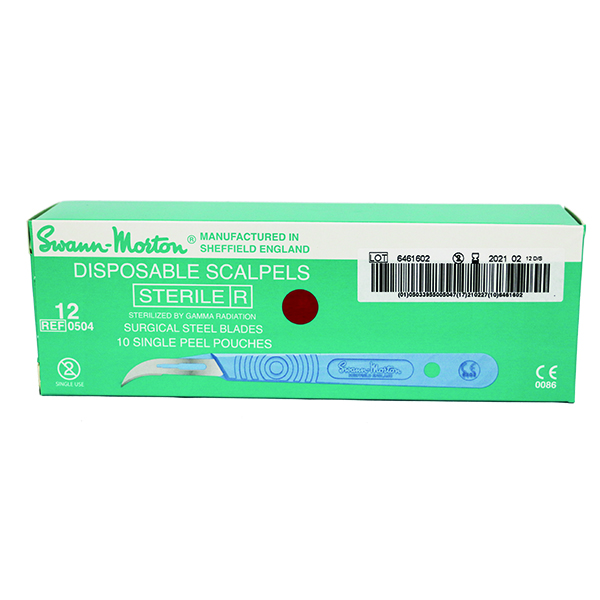 Skalpeller, blå plastskafter med rustfri blade, nr. 12, lancetformet-buet, sterile.