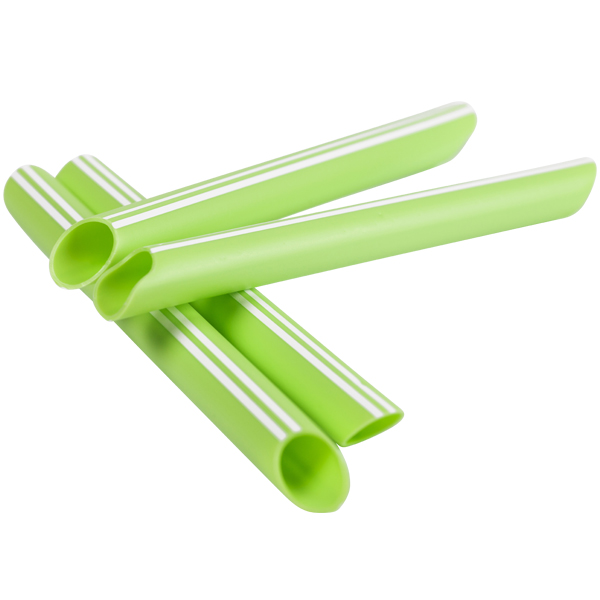 Sug til tykke sugeslanger, i biobaseret polyethylen, limegrønne med hvide striber, 12 cm, skråt afskåret i den ene ende og S-formet i den anden. OBS: kan IKKE autoklaveres.