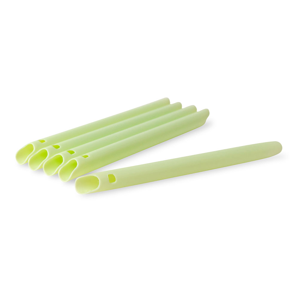 Sug til tykke sugeslanger med ventilationshul, S-formet afskåret i begge ender, fremstillet af fossilfri grøn polyethylen. Beregnet til engangsbrug. Grønne, længde 145 mm