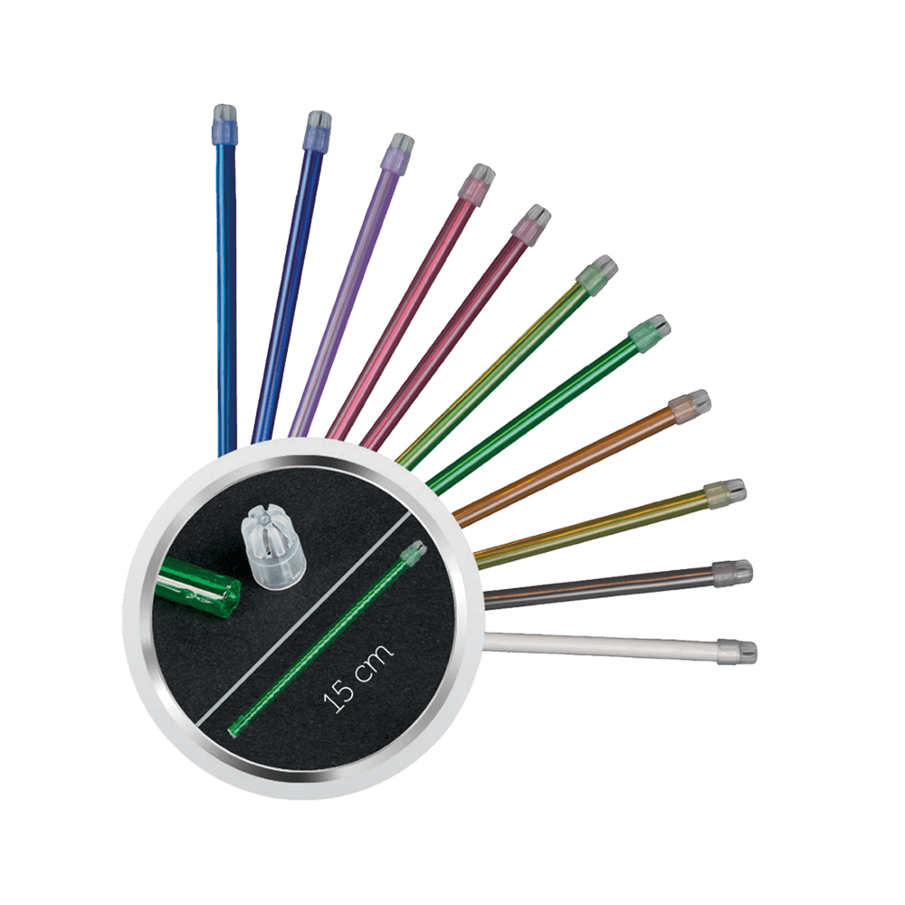 Spytsug til tynde sugeslanger, engangs, blød plast med bøjelig ståltråd og aftagelig sølvfarvet hætte i transparente farver, længde 15 cm, mørkeblå.
