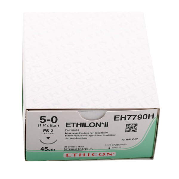 661H, Ethilon, ikke-resorberbar sort sutur, 0,15 mm, 5-0, 45 cm. Omv. skærende FS-2 nål. OBS. Fås nu kun i sort.