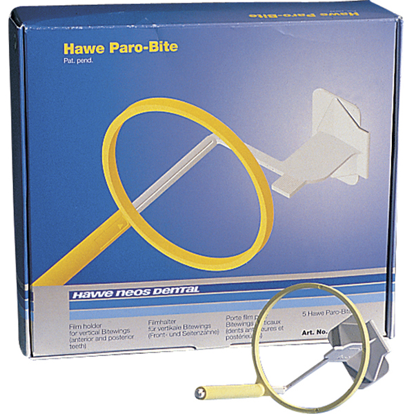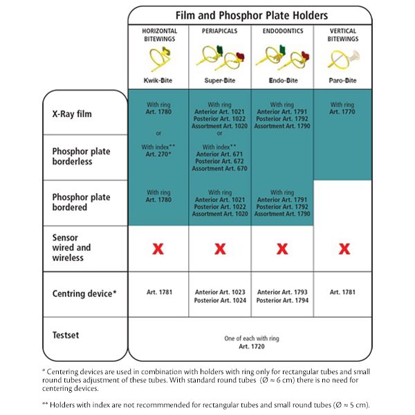 Filmholdere til vertikale Bite-Wing optagelser hos paradentosepatienter og til børn, med ekstraoral centreringsindikator, til filmplader uden ramme, autoklaverbar plast. Ved brug med centreringsskive velegnet til firkantet tubus.