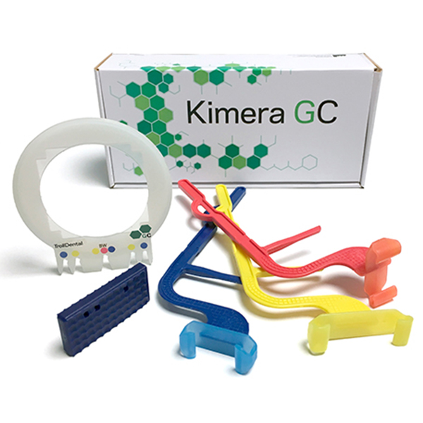 Filmholder i GC (Green Carbon) bioplast, har 40% lavere miljøpåvirkning end en holder af fossil plast, er støbt i et stykke med en stiv arm og en blødere holdeklo, til fosforplader str. 1, sæt med 1 rød holder (horisontal BW), 1 blå holder (apikal front og vertikal BW) og 1 gul holder (apikal molar og horisontal BW)