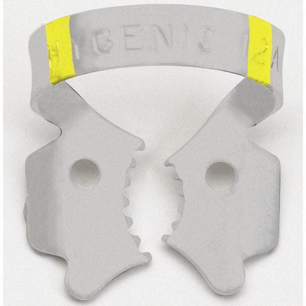Fiesta kofferdamklamme med vinger, farvekodet, mat finish, nr. 12A, med savtakkede kæber til molarer i overmunden, venstre side, gul.