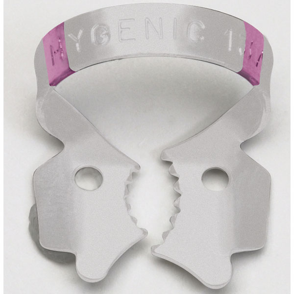 Fiesta kofferdamklamme med vinger, farvekodet, mat finish, nr. 13A, med savtakkede kæber til molarer i overmunden, højre side, pink.
