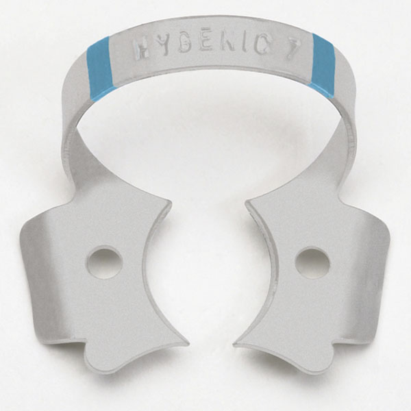 Fiesta kofferdamklamme med vinger, farvekodet, mat finish, nr. 7, med flade kæber, generelt brug til molarer i underkæben, turkis.