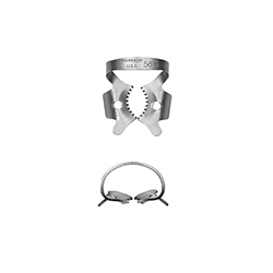 Kofferdamklamme med vinger, Satin Steel Alloy (blank), RDCM 56S, til molarer i UK og OK, med let festede, savtakkede kæber store molarer samt molarer med uregelmæssig facon.