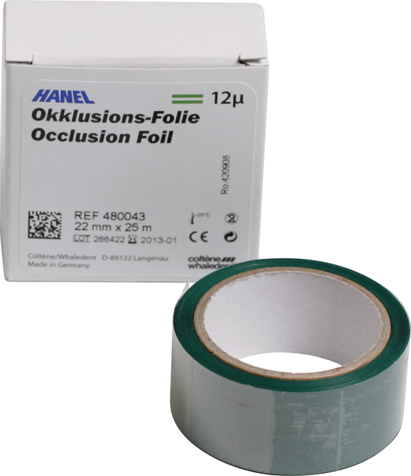 Folie till okklusions-/artikulationskontrol, 12 my, 22 mm bred, grøn, farve på begge sider.