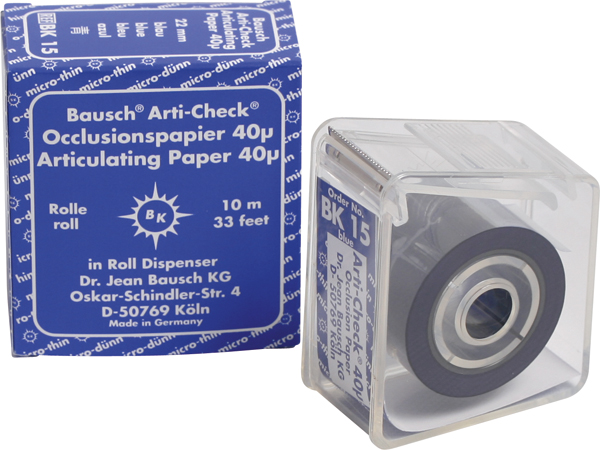 Papir til okklusions-/artikulationskontrol i rulle, blå, BK-15, 40 my, bredde 22 mm. Farven er coated og papiret er dobbeltsidet, dvs. afgiver farve på begge sider.