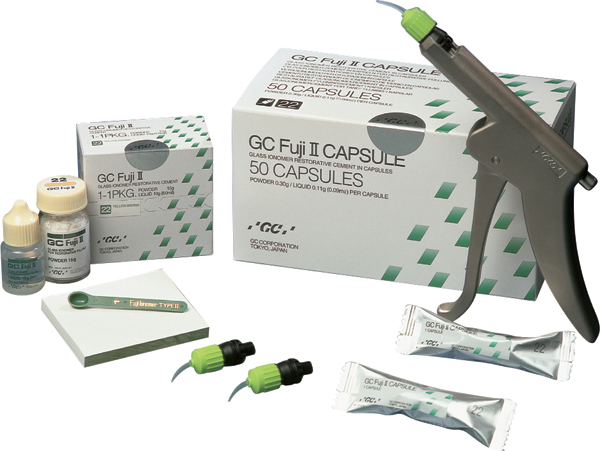 Glasionomercement, kemiskhærdende til klasse III og V fyldninger, primære tænder mm. Farve 21 (lysegul), i kapsler.