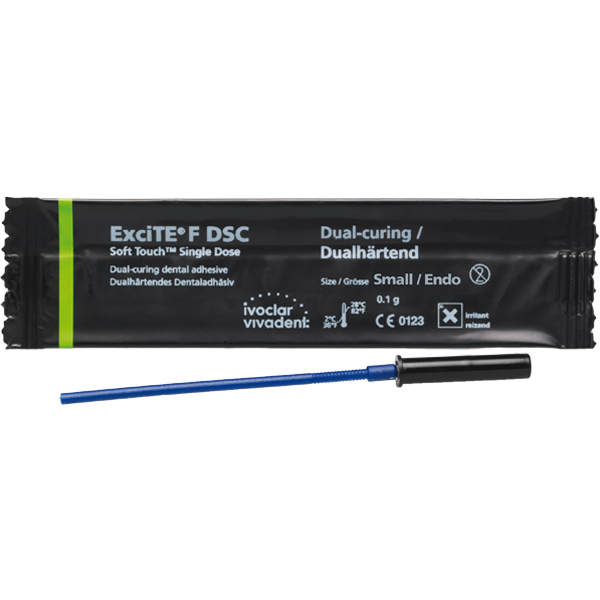 Bindingssystem, ethanolbaseret, lys- og kemiskhærdende, Small/Endo. Aktivatoren er indeholdt i applikatoren og blandes, når denne føres ned i engangskapslen.