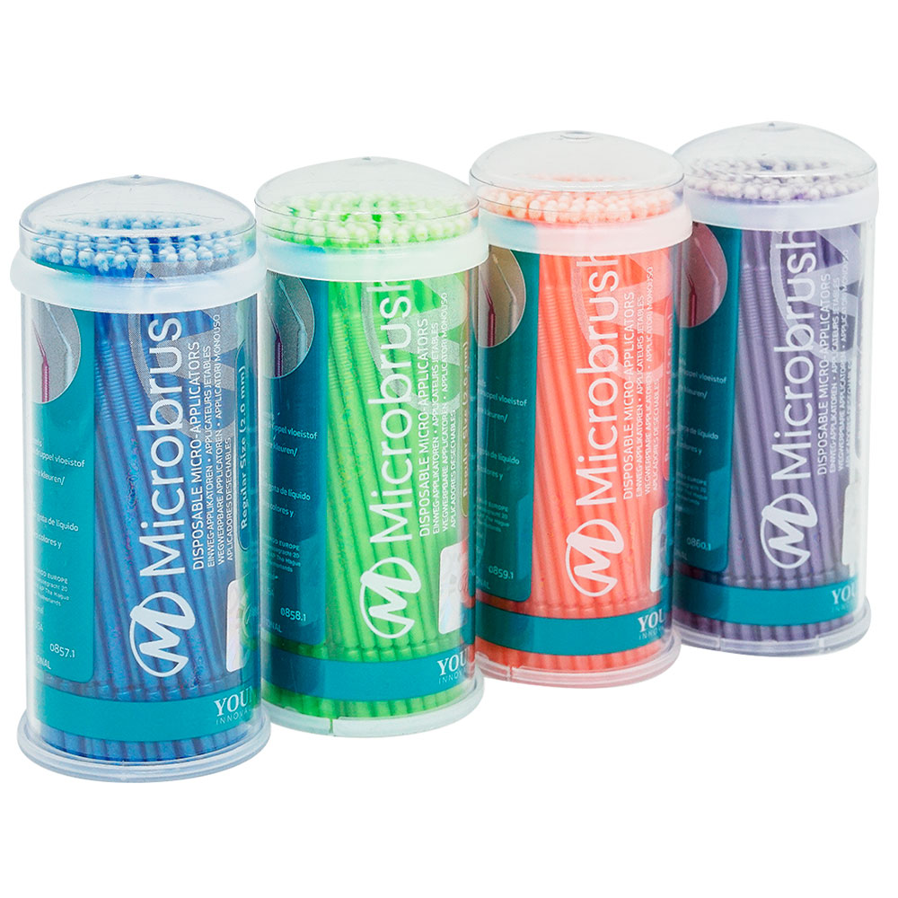 Applikatorer til præcis applicering af syregel, primer, bond mm., regular (2,0 mm), ass. blå, grøn, lilla og ferskenfarvet, i rør. OBS: Røret passer IKKE til Microbrush Plus dispenser.
