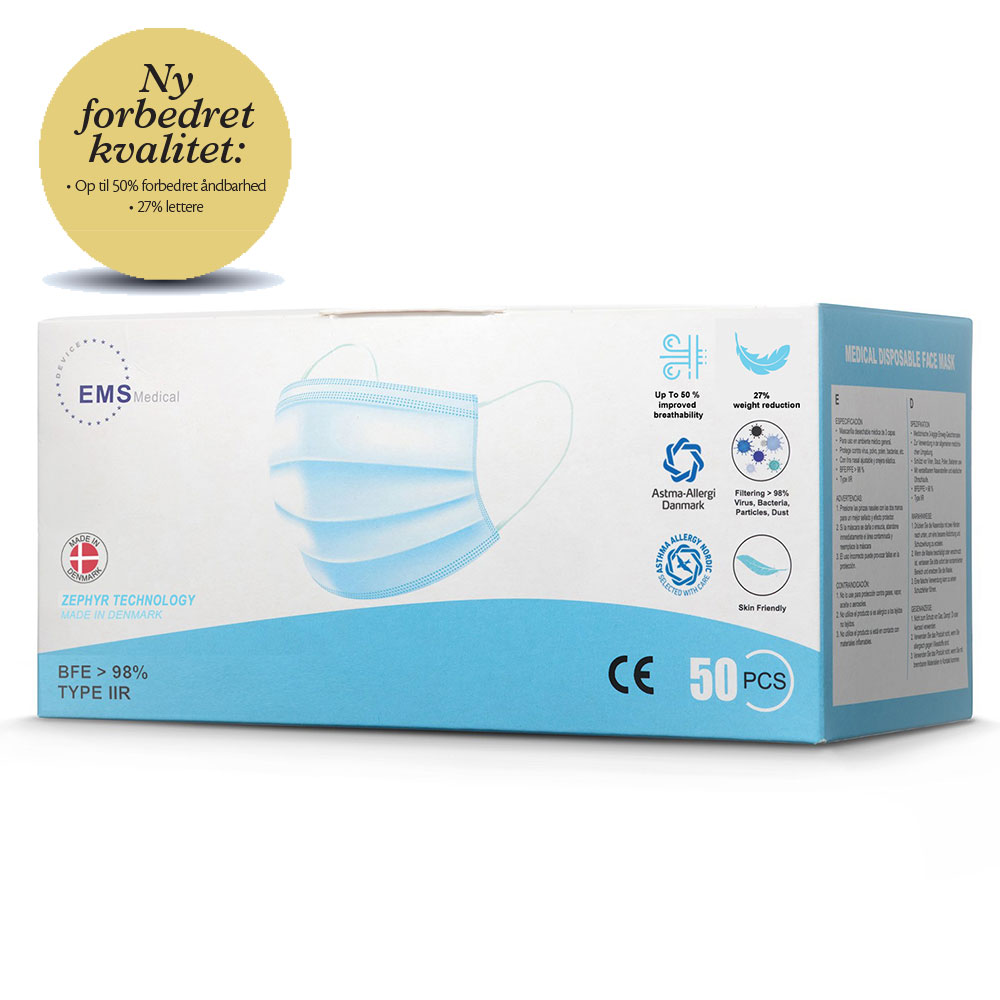 Dansk producerede medicinske mundbind med øreelastik og næseklemme, 3-lags. Opfylder standard EN 14683 type IIR, med en bakteriefiltreringsevne (BFE) på over 99%. Allergivenlige - godkendt og anbefalet af Astma-Allergi Danmark. Lugt-og latexfri. NY FORBEDRET VERSION med op til 50% forbedret åndbarhed og 27% lettere. OBS: Er kortere i elastikken end TopDent mundbind.
