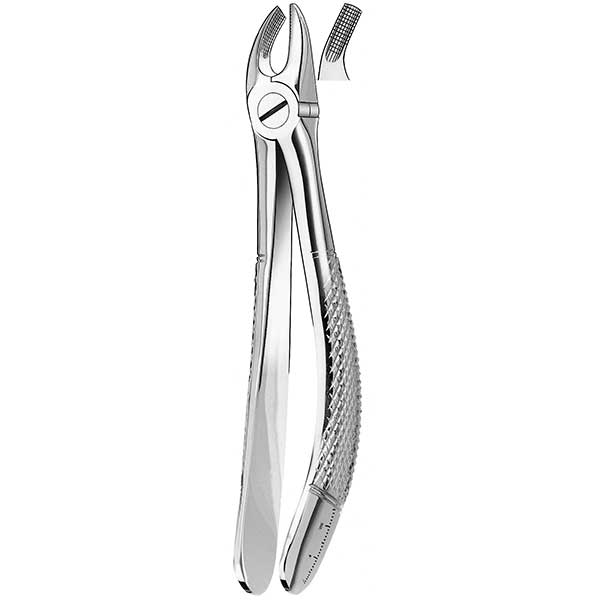 Carl Martin ekstraktionstang, pædo, til molarer i højre og venstre side i overkæben. Med relief-riller i kæberne og med rillet greb.