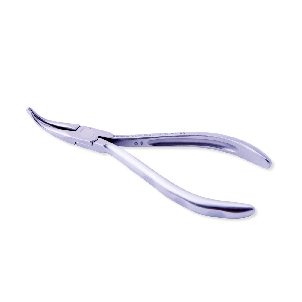 Ortodonti-tang til at sætte bånd på plads med, model How, vinklet med kryds-relief på spidsen af kæberne for bedre greb.