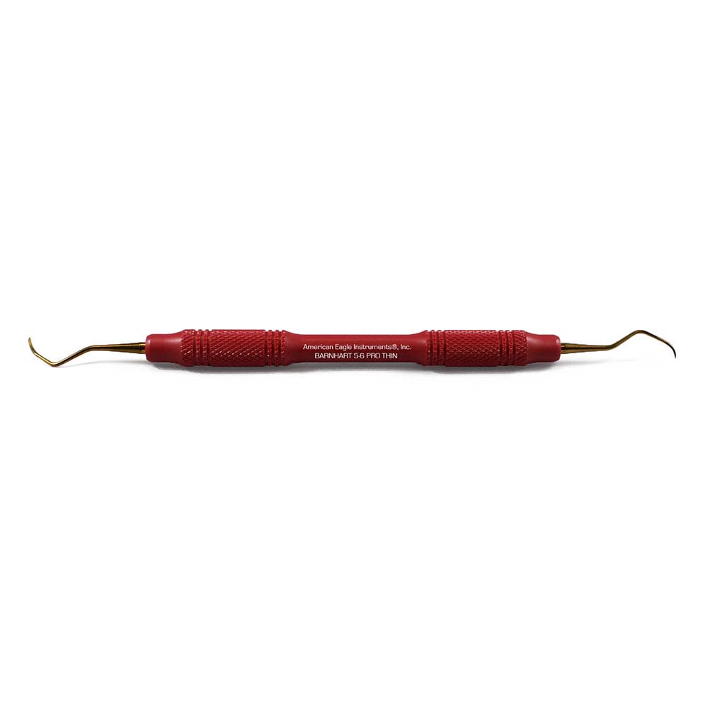 Curette, Barnhart 5-6, med smalt skær til posteriort brug, med guldfarvede ender og rødt plastskaft. OBS må ikke slibes.