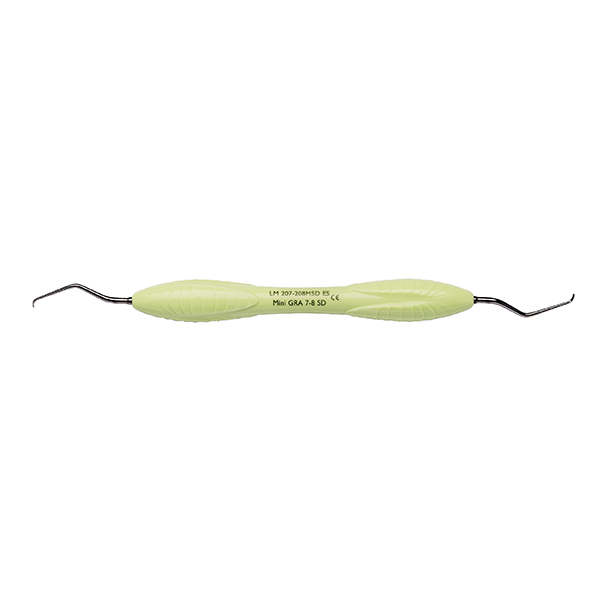 Curette, Mini Gracey 7/8, med længere hals og mindre arbejdende del end Standard, til buccale, mesiale og linguale overflader på præmolarer og molarer, SD Sharp Diamond, med coatede ender der ikke skal slibes, lysegrøn, ErgoSense silikonegreb.