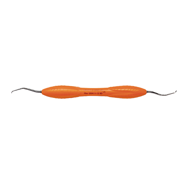 Curette, Mini Gracey 11/12, med længere hals og mindre arbejdende del end Standard, til mesiale overflader på præmolarer og molarer, SD Sharp Diamond, med coatede ender der ikke skal slibes, orange, ErgoSense silikonegreb.