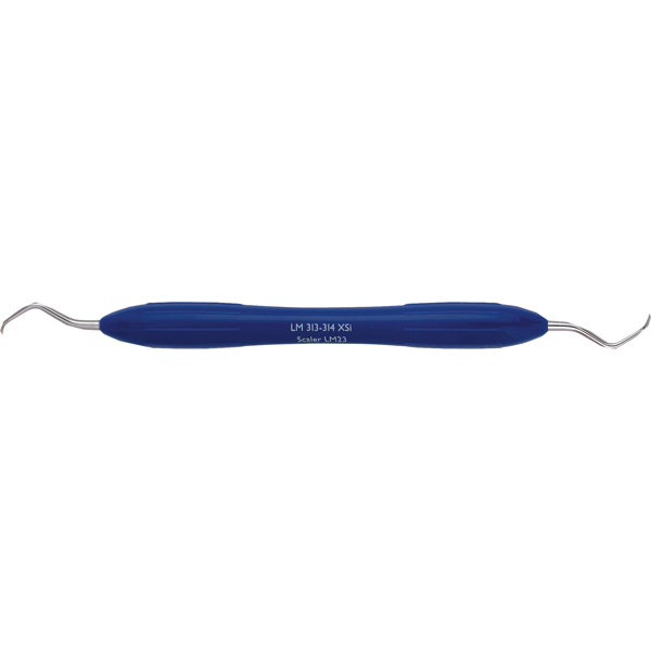 Posterior scaler, 313-314, Sickle, med kortere arbejdende del og længere hals end Mini Sickle, blå, ErgoMax silikonegreb.