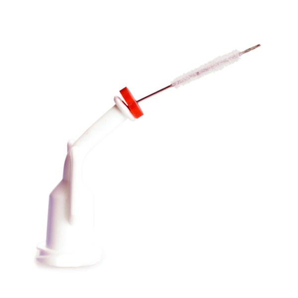 Usteril engangs skyllekanyle med fiberhår på den apikale del af kanylespidsen og bukket plast Lok-Tite gevind. Metalkanylens apikale del måler, med fiberhår, 0,68 mm i diameter. Anvendes til afrensning/fjernelse af calcium hydroxid fra kanalen med citronsyre inden rodfyldning. Passer til alle skyllesprøjter med luer/luer-lock gevind. 30 G, længde 17 mm, hvid.