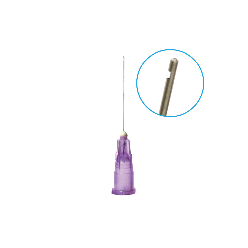Stumpe luer skyllekanyler med afrundet, lukket spids, kanylens åbning findes på siden, bevirker en skånsom skylning af rodkanaler og pocher, lilla, 30G, 0,3 x 23 mm.