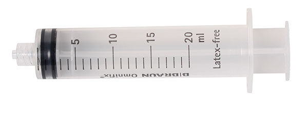 Engangssprøjter, steril plast, med indvendigt gevind, til kanyler med luerfatning, holder kanylen bedre fast, 20 ml, sterilt enkeltpakkede.