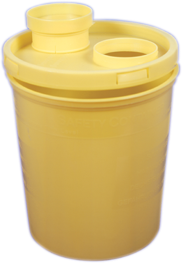 Beholder i kraftig plast, til spidse og skarpe genstande, rummer ca. 1,8 liter, gul. Låget har vendbar prop, så beholderen både kan lukkes midlertidigt under brug og permanent (forsegling) inden aflevering.