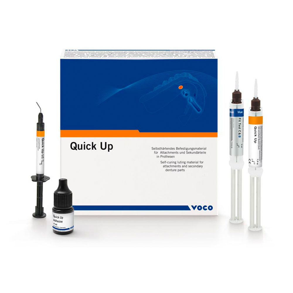 Sæt med QuickMix sprøjte med 7,5 g Quick Up, sprøjte med 2 g Quick Up LC, flaske med 4 ml adhæsiv, QuickMix sprøjte med 5 ml Fit Test C & B samt tilbehør.